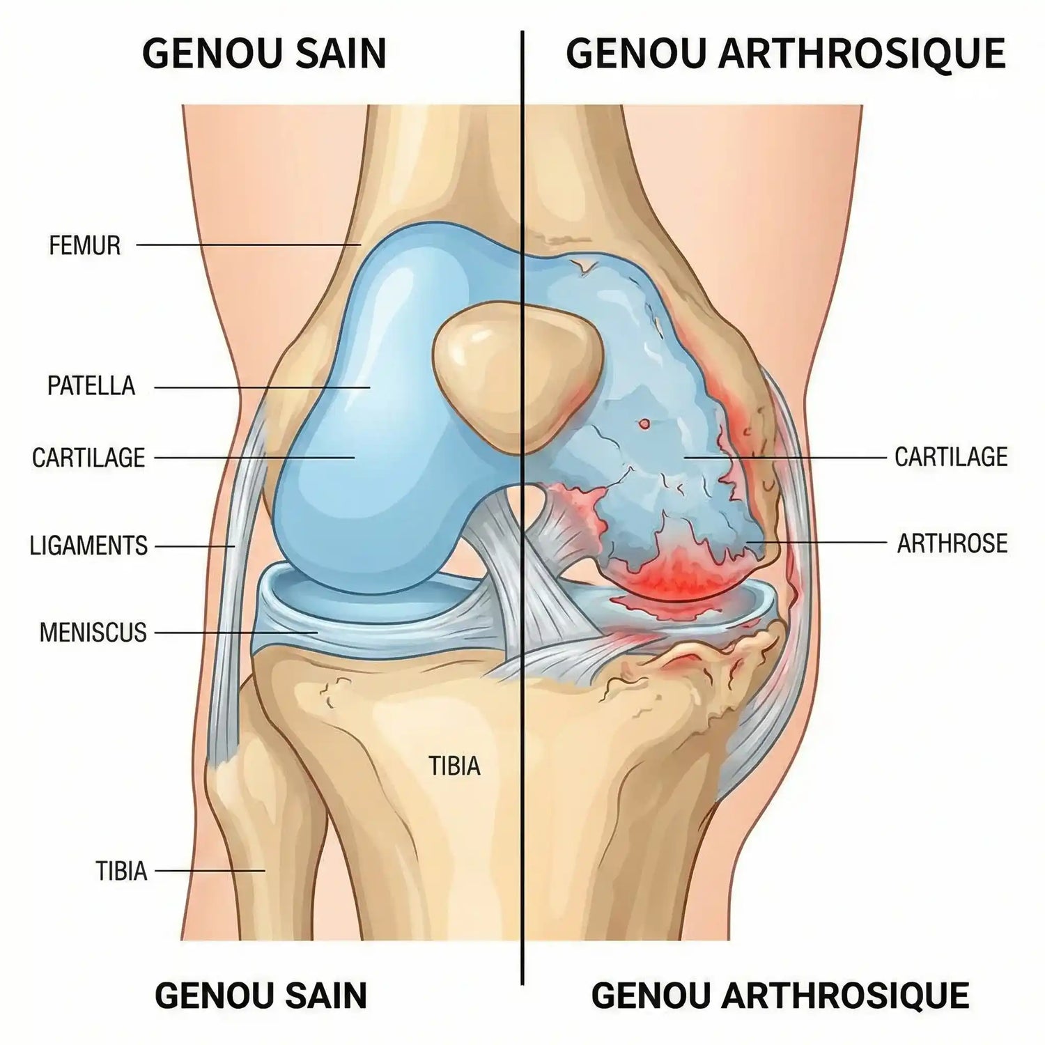 Dans un genou sain, le cartilage permet un glissement parfait. Avec la gonarthrose, ce cartilage se dégrade irréversiblement, déclenchant une réaction en chaîne :